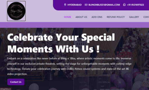 Designed Bling n’ Bliss website with clean layout, intuitive navigation, and immersive interface, reflecting premium, personalized event celebrations, private theater experiences, and unforgettable memorable moments