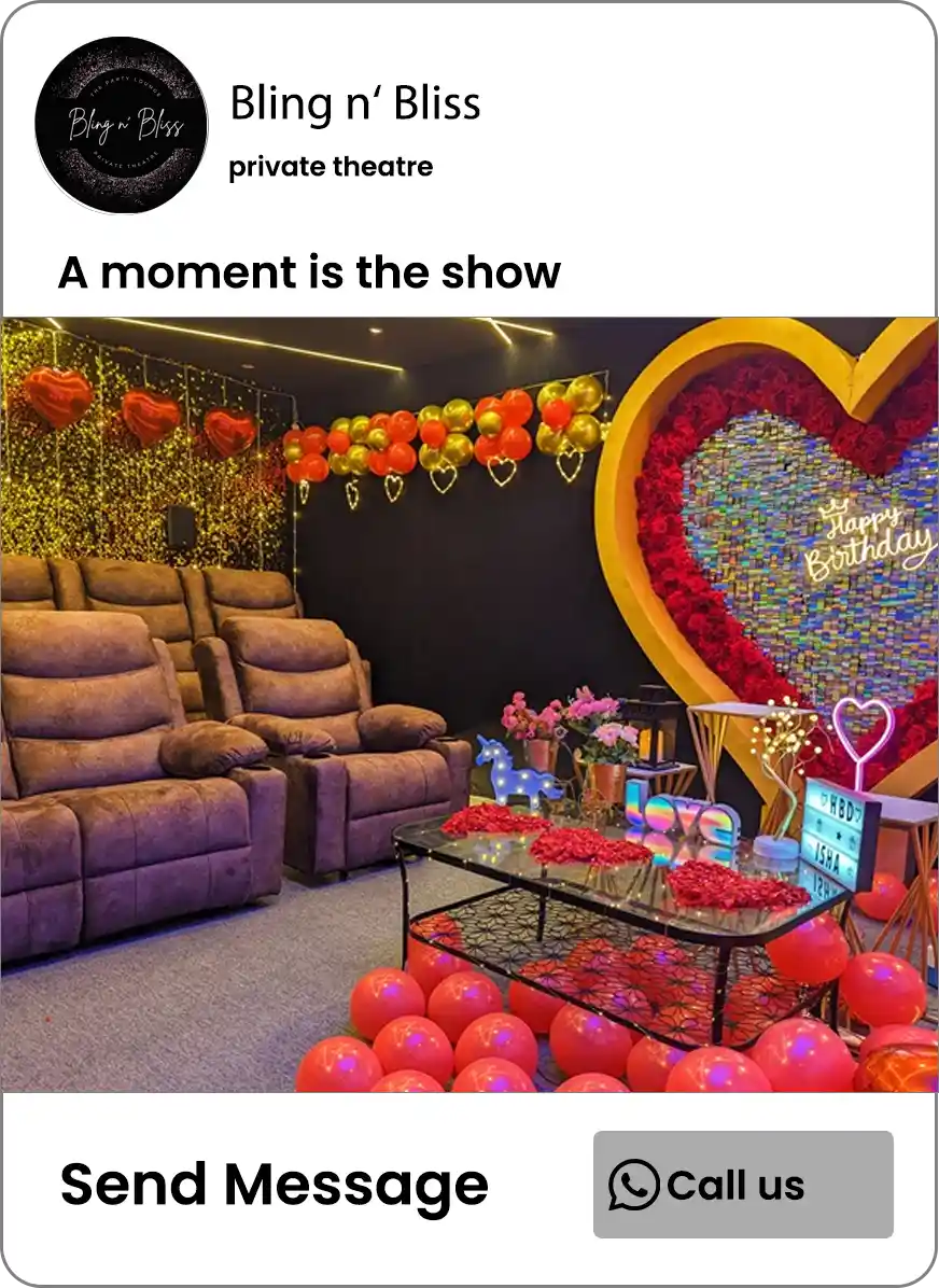 “Bling n Bliss transforms every celebration into an unforgettable experience with private theaters and exclusive event spaces in Hyderabad. From birthdays and anniversaries to romantic dates, we combine stunning 4K visuals, immersive sound, and personalized setups to create magical moments. Enjoy movies and celebrations like never before, making each event truly special. Powered by Galaxy Tech Solutions.”
