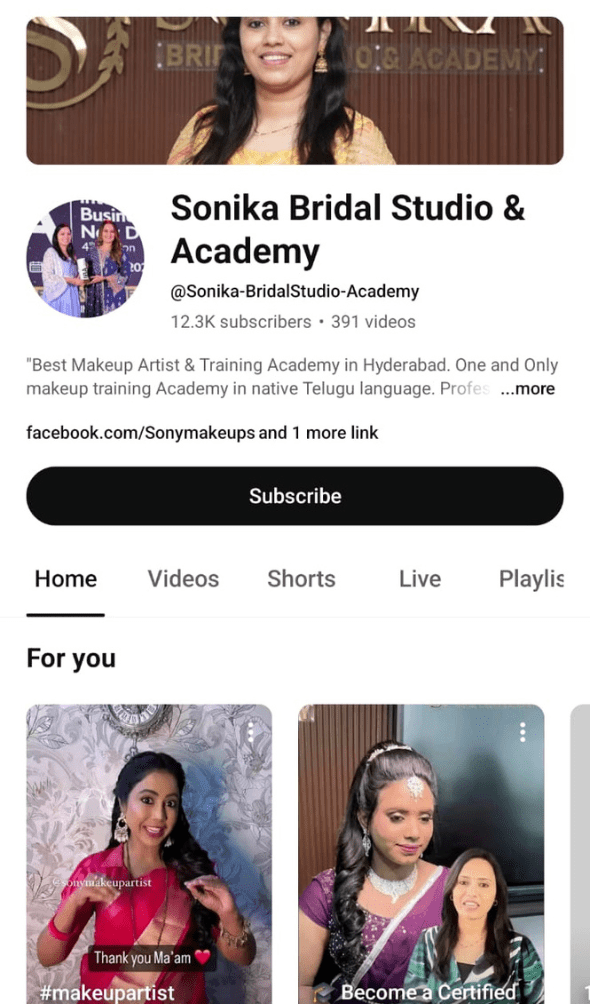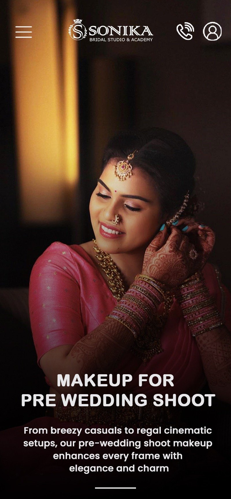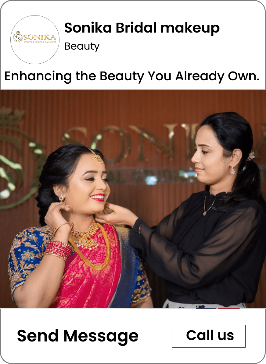“Sonika Bridal Studio & Academy, led by award-winning makeup artist Sonika Akula, delivers personalized bridal makeovers and professional beauty training. With 2,000+ bridal transformations and hands-on courses, we empower brides and aspiring artists with confidence, elegance, and expertise for every wedding and special occasion. From subtle looks to glamorous styles, every service and course is tailored for perfection. Powered by Galaxy Tech Solutions.”