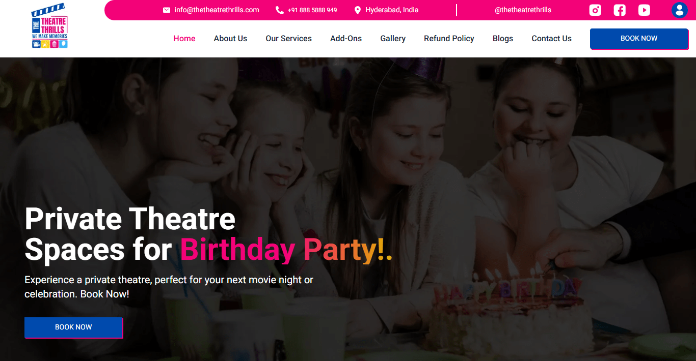 “Theatre Thrills elevated its brand presence and audience engagement with Galaxy Tech Solutions. Through digital transformation, enhanced UI/UX, and strategic online positioning, Galaxy Tech improved visibility, customer trust, and credibility; enabling Theatre Thrills to offer unforgettable private cinema experiences and personalized events, delighting clients across Hyderabad with seamless, memorable, and uniquely curated entertainment moments.“